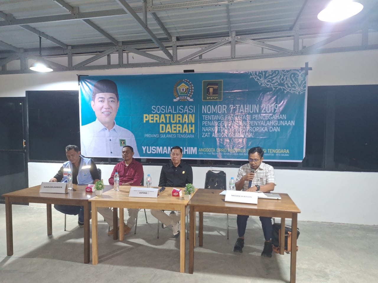 Sosialisasi yang dipandu Darmawan Abdullah ini, melibatkan dua Anggota BNN Kota Baubau, La Ode Ali Husein dan Harlis Eshaya dengan menghadirkan puluhan peserta dari unsur generasi muda, dan anggota karang taruna setempat serta para pelajar dan mahasiswa. Saat membuka Sosialisasi, Yusman Fahim menyatakan, sosialisasi menjadi salah satu agenda DPRD Provinsi Sultra. Karena itu Yusman mengajak para generasi muda untuk berdiskusi, berdialog terkait bahaya Narkotika yang menjadi salah satu focus perhatian negara. “Generasi muda sebagai penerus bangsaa amatlah penting untuk mengetahui bahayanya Narkotika, sehingga dapat berperan dalam membantu pemerintah mensosialisasikan pentingnyaa melakukan pencegahan penggunaan Narkotika dan zat adiktif lainnya” kata saudara kandung Wali Kota Baubau saat membuka acara.