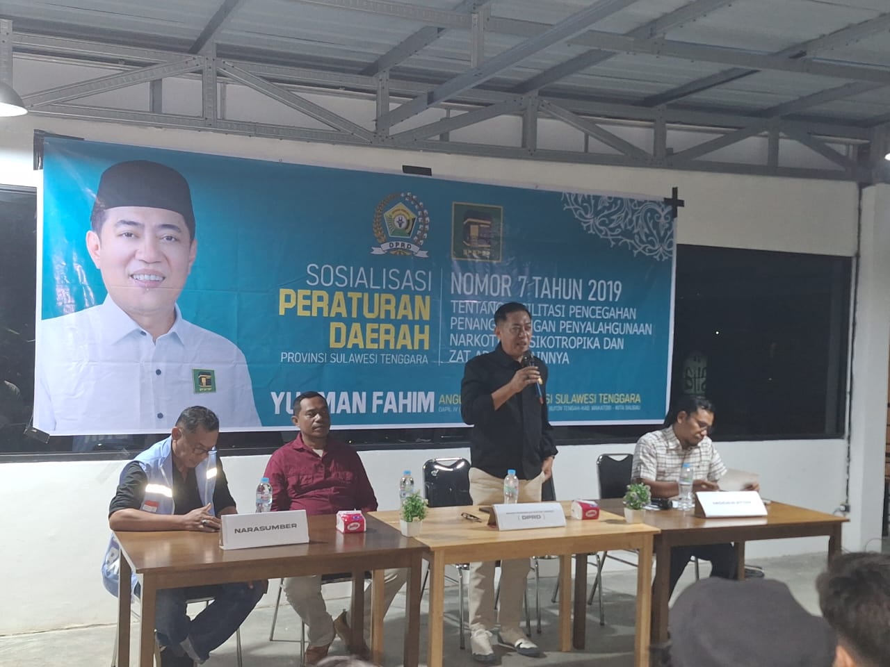BAUBAU-Anggota DPRD Provinsi Sulawesi Tenggara, Yusman Fahim, mensosialisasikan Peraturan Daerah (Perda) Provinsi Sulawesi Tenggara Nomor 7 Tahun 2019 tentang fasilitasi pencegahan penanggulangan penyalahgunaan Narkotik, Psikotropika dan Zat Adiktif lainnya. Kegiatan tersebut dilaksanakan di lantai dua Warkop Sija, Kelurahan Lamangga, Kecamatan Murhum, Kota Baubau, pukul 21.00 Wita.